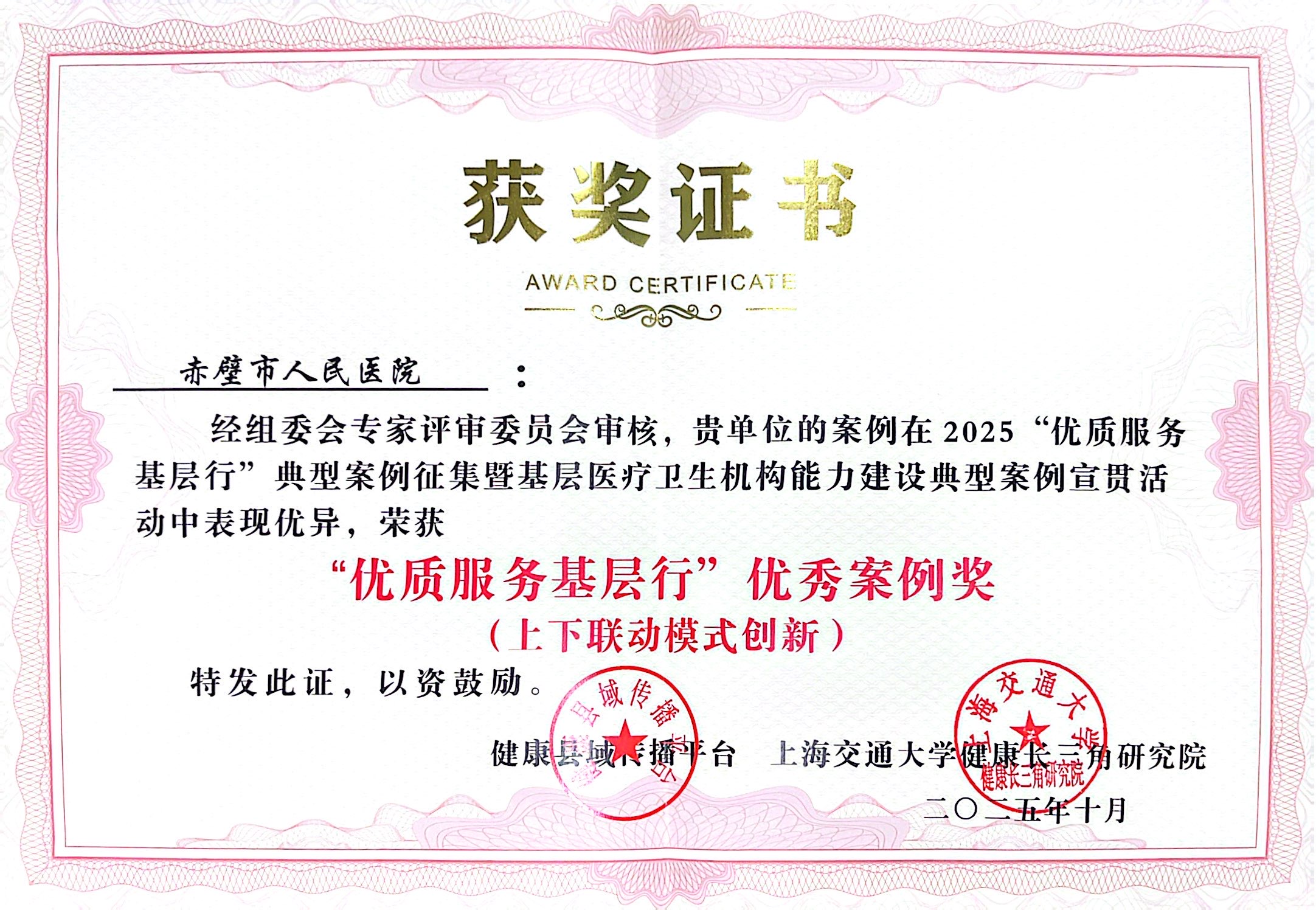 2025年10月23日-26日,由健康县域传播平台联合中国医药卫生文化协会等权威机构主办的“2025紧密型医共体发展大会(华东地区)”在安徽省金寨县隆重召开。赤壁市卫健局领导及我院领导受邀参会,与全国医疗卫生管理者、专家学者共探基层医疗数智化转型与高质量发展之道。会上,我院凭借在紧密型医共体建设中的创新实践,我院荣获“优质服务基层行”优秀案例奖,标志着我院在基层医疗服务能力提升方面获得国家级认可。