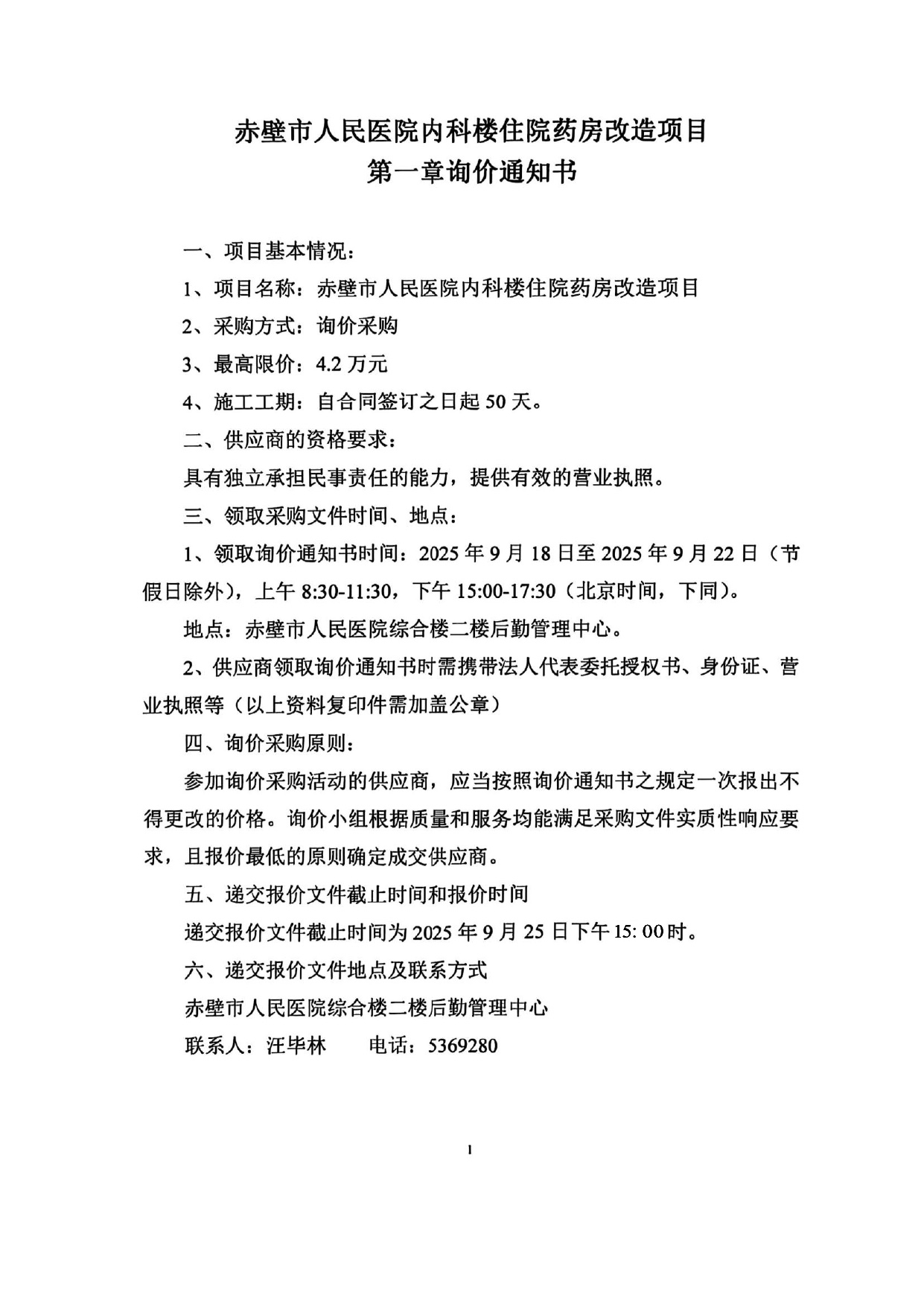 赤壁市人民医院内科楼住院药房改造项目 第一章询价通知书