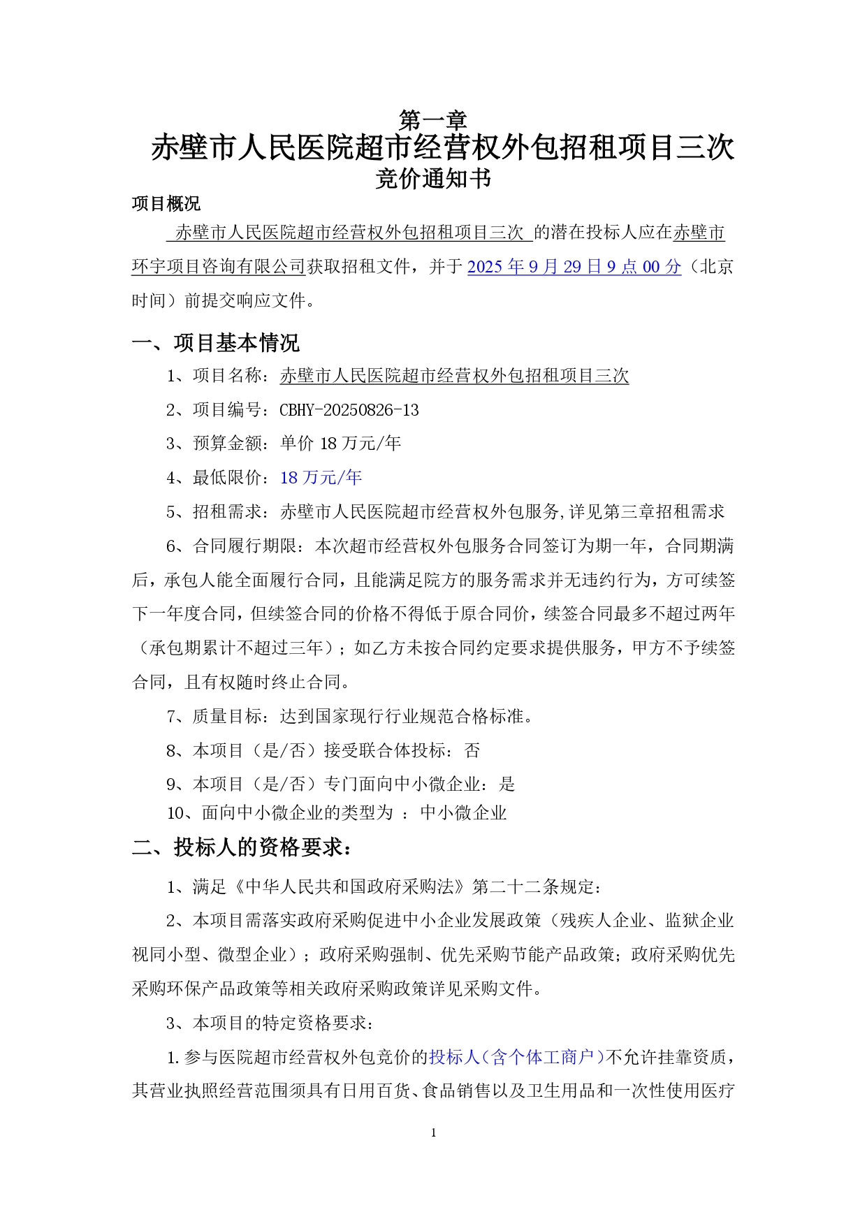 赤壁市人民医院超市经营权外包招租项目三次竞价文件