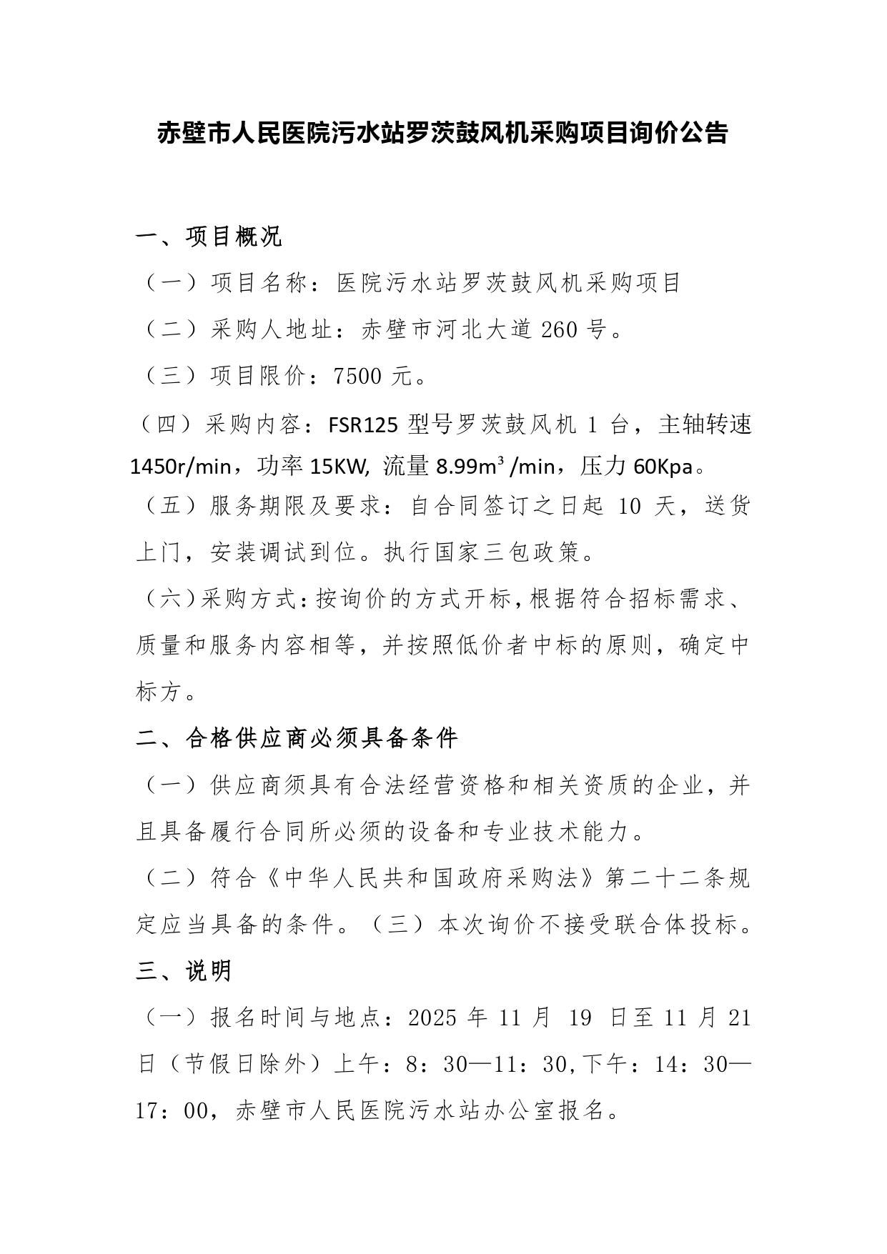 赤壁市人民医院污水站罗茨鼓风机采购项目询价公告