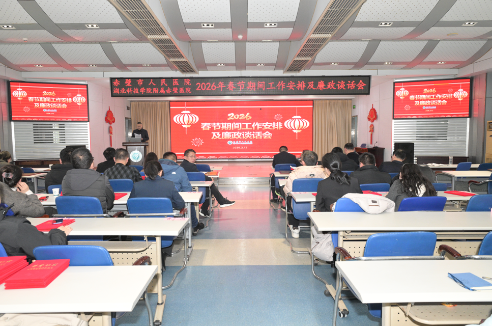 新春将至,警钟长鸣。为深入贯彻湖北省纪委全会精神,推进清廉医院建设,筑牢干部职工廉洁防线,2月6日,赤壁市人民医院(湖北科技学院附属赤壁医院)召开2026年春节前集体廉政谈话会。党委书记祝敬华作集体廉政谈话,党委委员、副院长郑洲主持,医院党委班子、中层干部及先进个人代表参会,共同接受廉政警示教育。